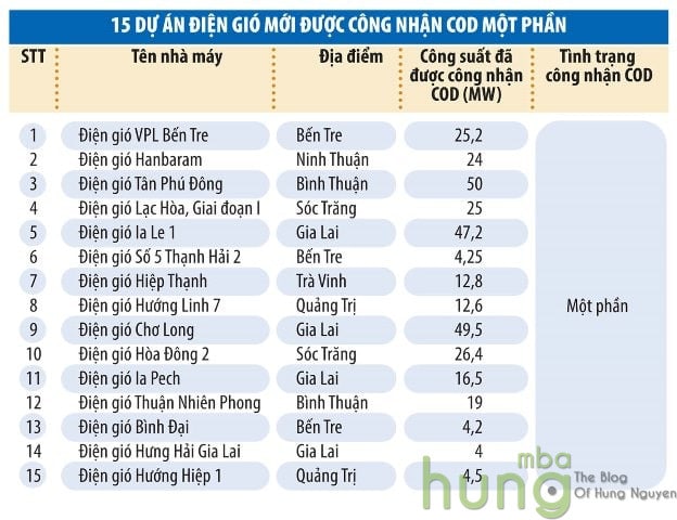 Cũng trong báo cáo của EVN còn có danh sách 15 dự án điện gió khác được liệt kê là mới COD được một phần dự án. Trong số này có Dự án điện gió Hưng Hải Gia Lai mới COD được 4 MW; Nhà máy điện gió Hướng Hiệp 1 mới COD được 4,5 MW, hay Nhà máy điện gió Bình Đại mới COD được 4,2 MW… Lớn nhất trong đó là Nhà máy điện gió Tân Phú Đông đã COD được 50 MW, nhưng vẫn còn khá xa so với mức công suất 150 MW đã ký PPA.